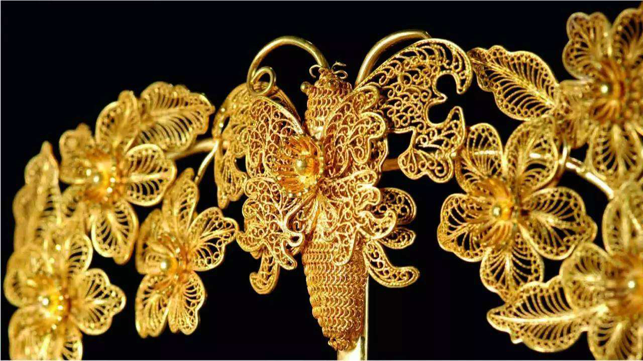 花絲鑲嵌,簡稱:花嵌,又叫細金工藝,是一門傳承久遠的中國傳統(tǒng)手工技藝,主要用于皇家飾品的制作。為“花絲”和“鑲嵌”兩種制作技藝的結(jié)合?;ńz選用金、銀、銅為原料,采用掐、填、攢、焊、編織、堆壘等傳統(tǒng)技法。鑲嵌以挫、鎪、捶、悶、打、崩、擠 、鑲等技法,將金屬片做成托和瓜子型凹槽,再鑲以珍珠、寶石。 花絲鑲嵌的基礎是花絲?;ńz拉制前,要將銀條放在軋條機上反復壓制,直到成為粗細合適的方條狀后,才能開始正式的拉絲,專用的手工拉絲工具稱為拉絲板,上面由粗到細排列著四五十個不同直徑的眼孔。眼孔一般用合金和鉆石制成,最小的孔比頭發(fā)絲還要細。在將粗絲拉細的過程中,必須由大到小依次通過每個眼孔,不能跳過,有時需要經(jīng)過十幾次拉制才能得到所需的細絲。最初拉制的銀絲表面粗糙,要費很大力氣,經(jīng)過幾次拉制后才逐漸變得光滑。